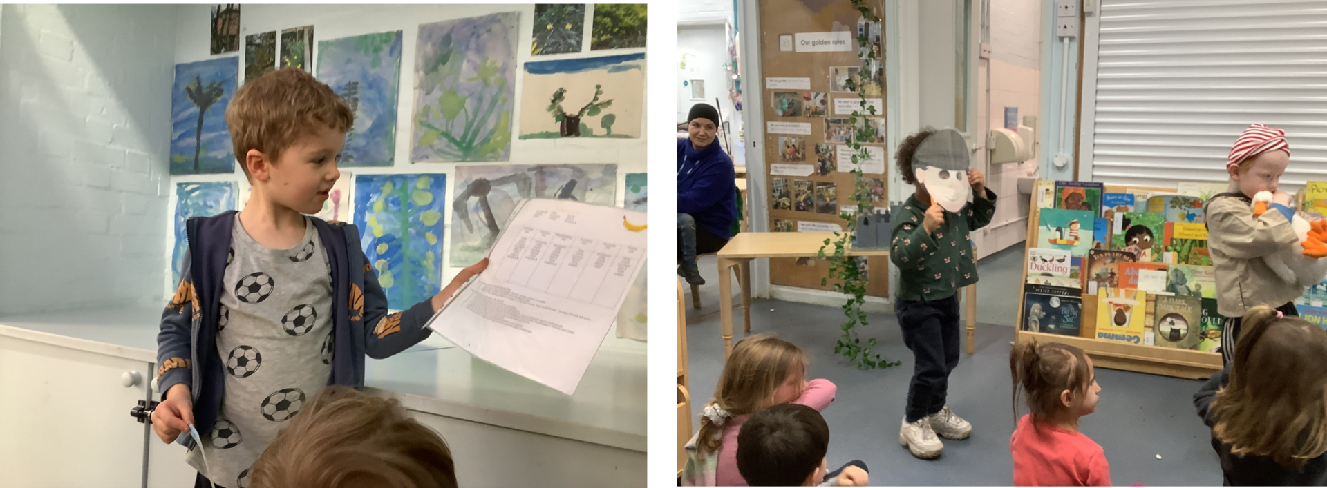 In Green Room, children quickly recognise the symbols and love using them to invent simple stories. They create names for their characters, explore what might happen next, and eagerly share their ideas. The approach strengthens listening and attention skills, encourages collaboration, and helps children build on one another’s creativity as they develop rich, imaginative narratives together.